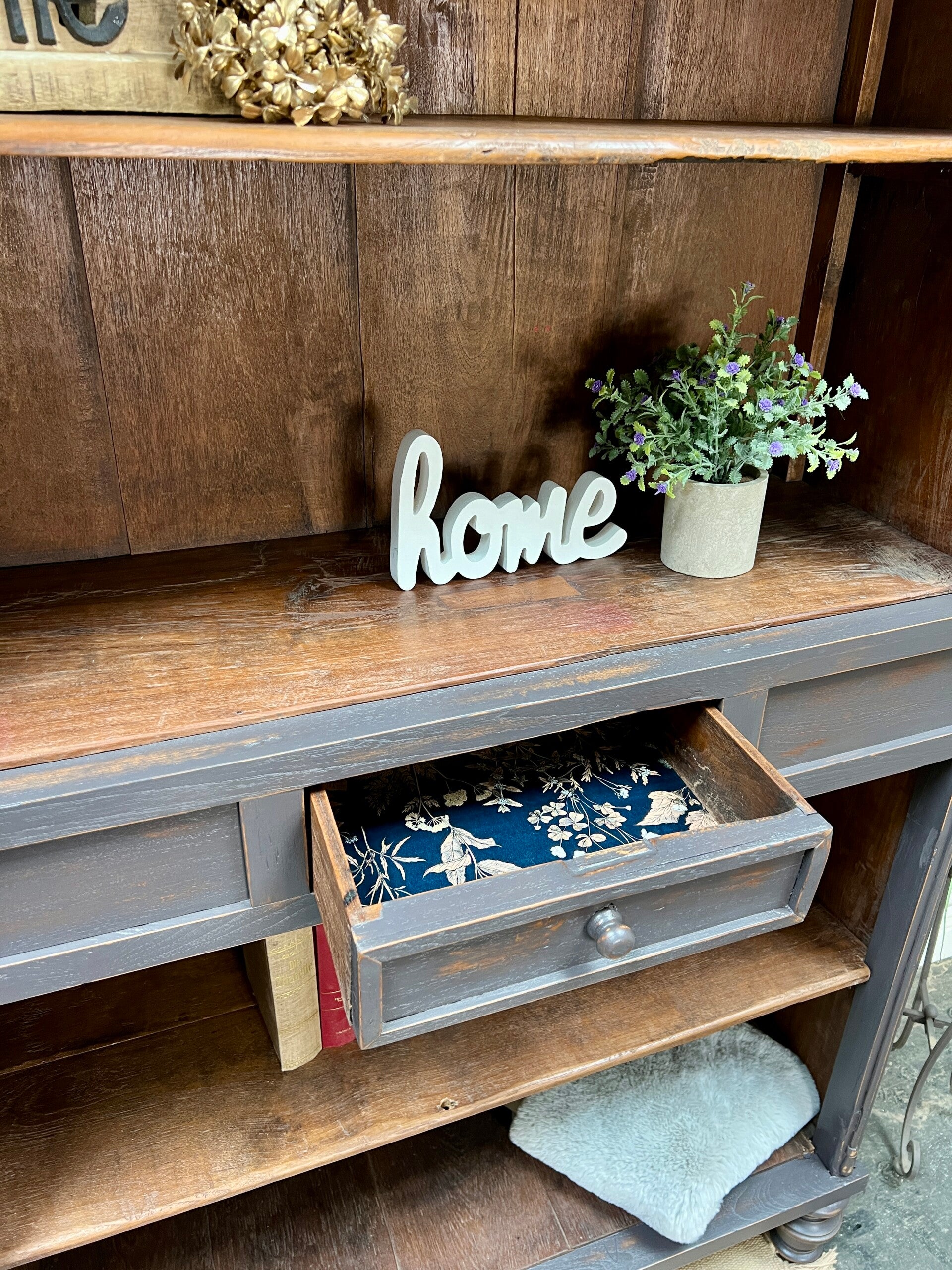 Der Lack wurde an bestimmten Stellen bewusst geschliffen sodass das Original Holz zum Vorschein kommt.