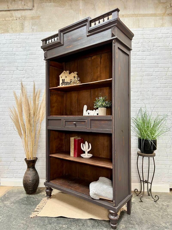 Dieses Bücherregal aus Vollholz ist in einem Anthrazit Ton lackiert.