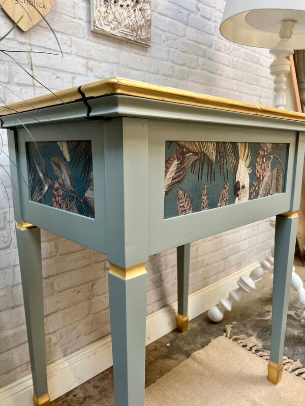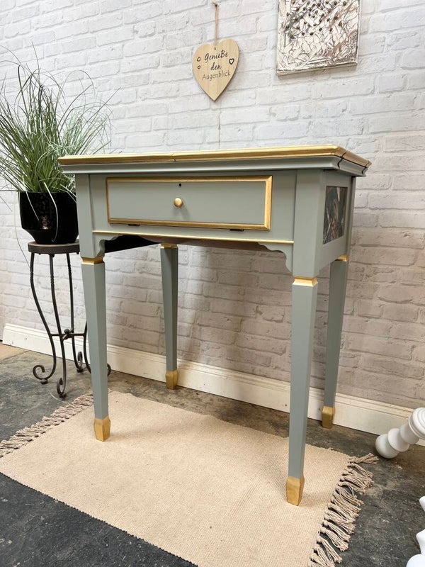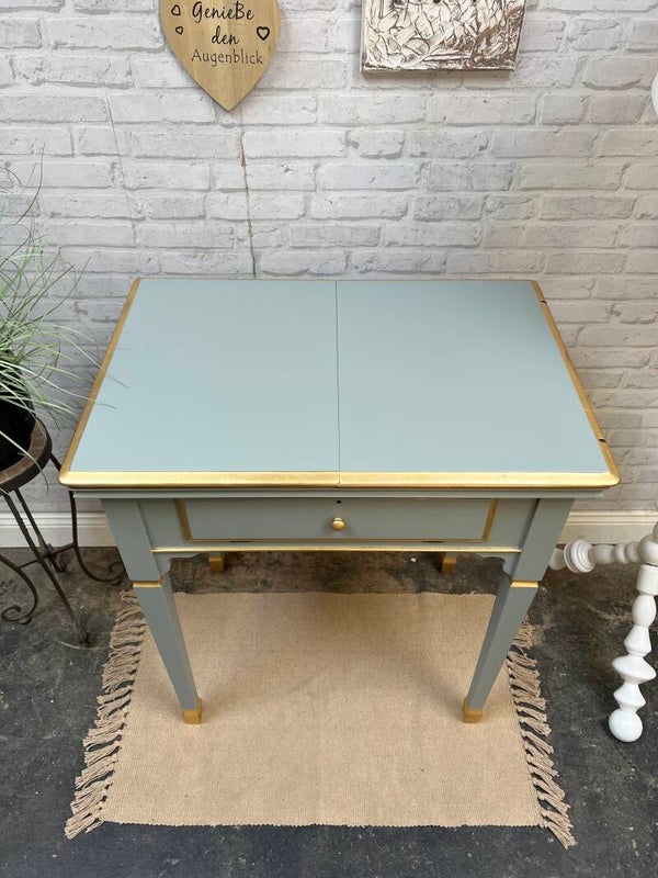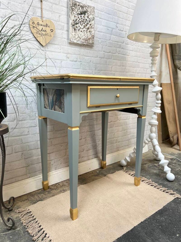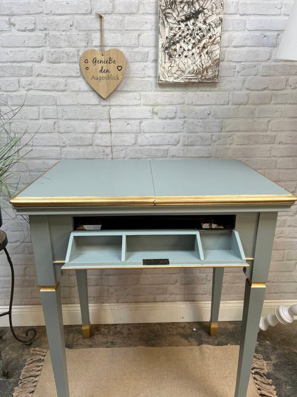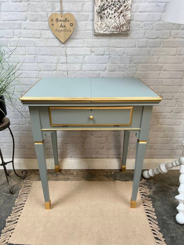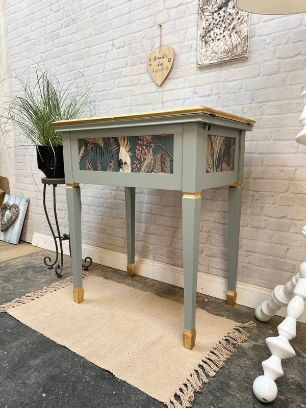 Dieser Nähmaschinentisch wurde liebevoll aufgearbeitet und in einem modernen Hellgrün/Grau neu lackiert.