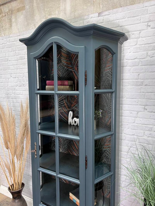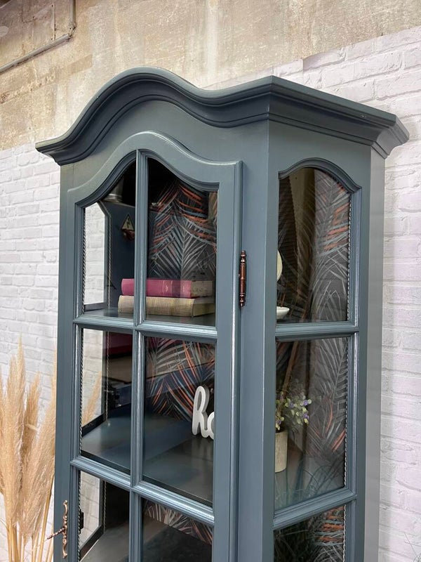 Mit ihrer geschwungenen Krone und den klassischen Formen verbindet diese Vitrine traditionelles Design mit modernem Flair.