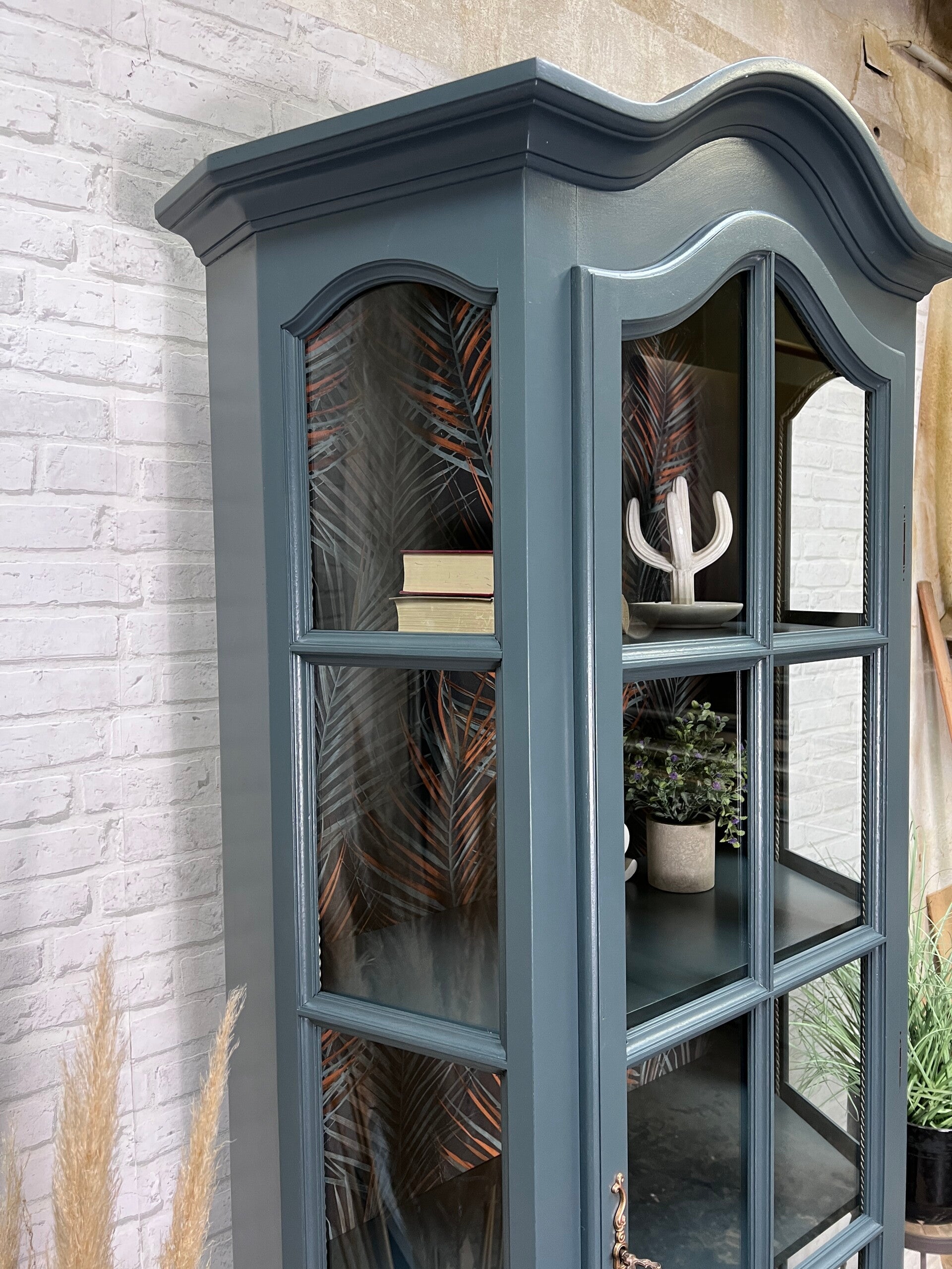 Mit ihrer geschwungenen Krone und den klassischen Formen verbindet diese Vitrine traditionelles Design mit modernem Flair.
